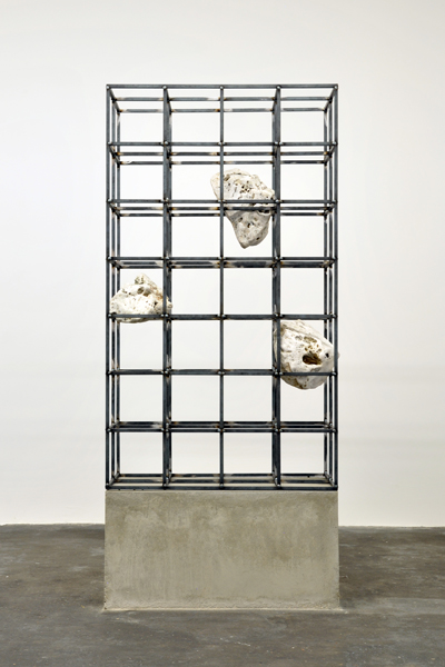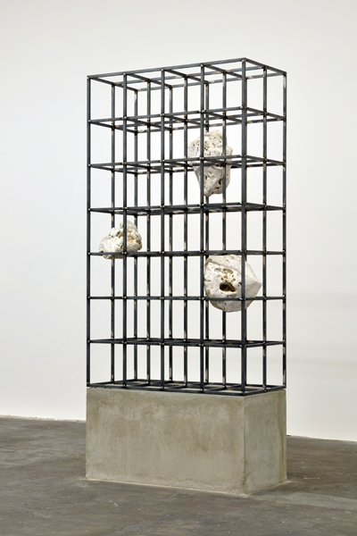 In Automat, Choi uses forms that are as organic as they are strictly geometrical. A steel framework consisting of several cubes produced by industrial construction methods is placed on a concrete pedestal. Wedged into its hollows are bright natural stones, which seem to be floating there. Choi´s works are preceded by studies in urban space and direct the gaze to the fleeting and momentary.