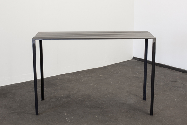 The work T consists of narrow metal table, between whose metal ribs beans are distributed on the tabletop. The arrangement recalls the sheet music for a composition. Through her choice of materials and the traces of manual intervention, Choi unites poetic and sterile qualities of the metal elements.