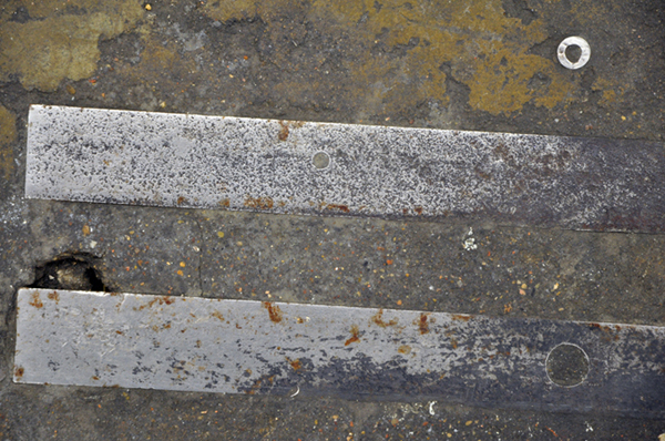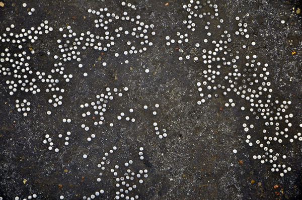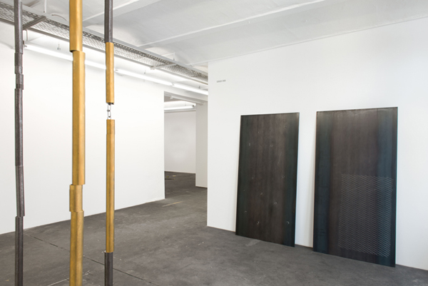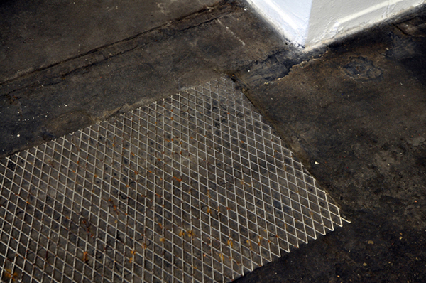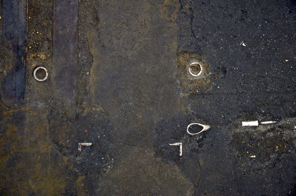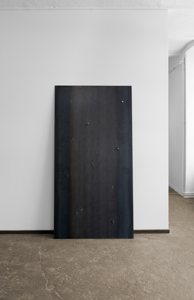They told me that the building where TANAS is now located had always been used an an industrial building. A small production firm was last housed in TANAS´s rooms. Predominately women had worked there, but no one knew exactly what the workers had produced. The only thing certain was that the women´s work had involved assembling small parts. I began to think about these women and the room they worked in. Visiting TANAS, I was struck by the many small circles, lines and points in the floor. Taking a closer look, I recognized the remains of steel pipes that apparently had been sawed off at the floor level and must one have risen from the floor. I also spotted embedded bolts and other steel elements. A myriad of silver points reminiscent of the stars at night sparkled on the floor of one room. Why the rivets had been hammered in there, and whether all these metal elements represents traces of the work the women once did, remains unclear. For a long time I puzzled over the history of there rooms, about which so little is known, and decided to created pictures and sculptures with these fragmentary clues.