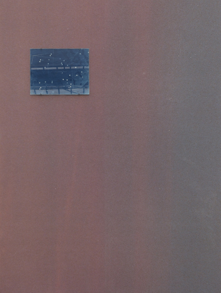 to document her specimens from as early as 1843. The artist brings together different histories and ideas behind the technique to create something new. With a nod to Adkins, Choi makes cyanotypes with leaves she finds around the city, cracked and eaten in parts by insects, while she is drifting in a state of dérive akin to that of the Situationists’ wanderings. The images she creates are always a surprise, as they are the product of chance-encounters. In a new experiment, Choi has created a wallpaper from inkjet prints based on her photographs of enlarged advertisements depicting urban skylines. This functions as a backdrop as well as a reproducible digital image in contrast to the unique handcrafted cyanotype prints. (Angelique Campens, Curator)