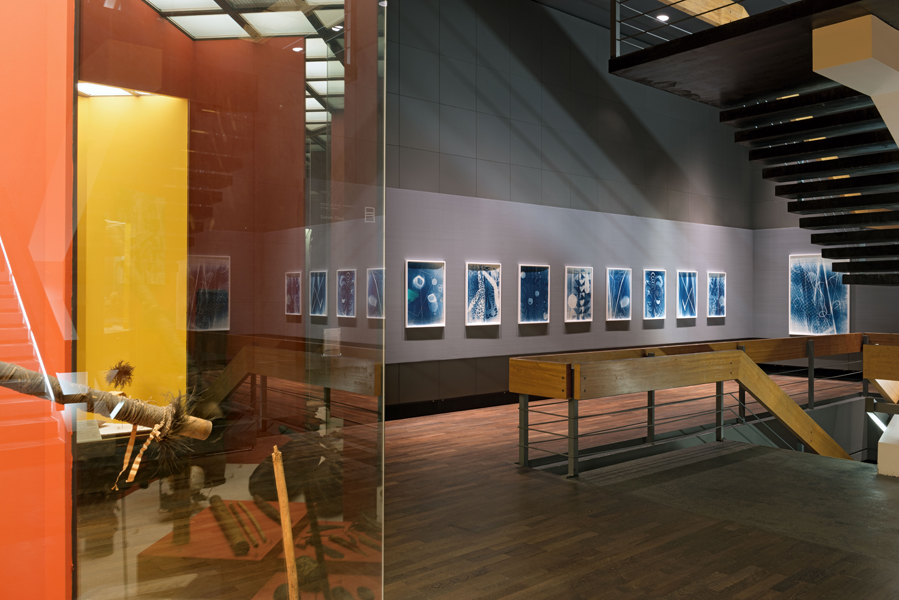 The cyanotypes were produced in the photo lab of the Ethnologisches Museum using ten objects (club, fishing rod, fish trap, axe, wood knife, boomerang, wooden mallet, bow and arrows) from the storerooms of the Oceania Department in March 2015. (Angela Rosenberg, Curator)