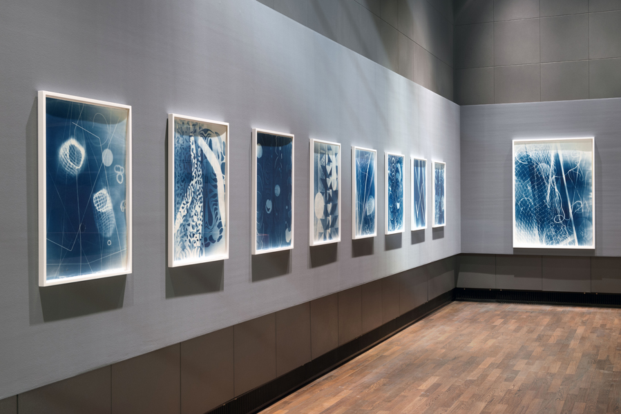 Sunah Choi has rediscovered a technique based on the principle of the photogram. This photographic technique dating from the nineteenth century produces cyan-blue images. Objects exposed to ultraviolet light leave pale shadows on photosensitive paper and give rise to photograms. The British botanist Anna Atkins had already used this process in 1843 to document comparative plant studies. With the dramatic reversal of dark shadows into pale shapes the photogram was to become a popular technique of generating pictures among the surrealists; various artists used it to create highly evocative images by the simplest of means.