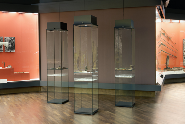 3 Stencils, objects from the oceania collection of the Ethnologisches Museum in 3 illuminated vitrines