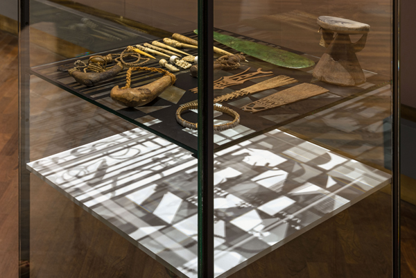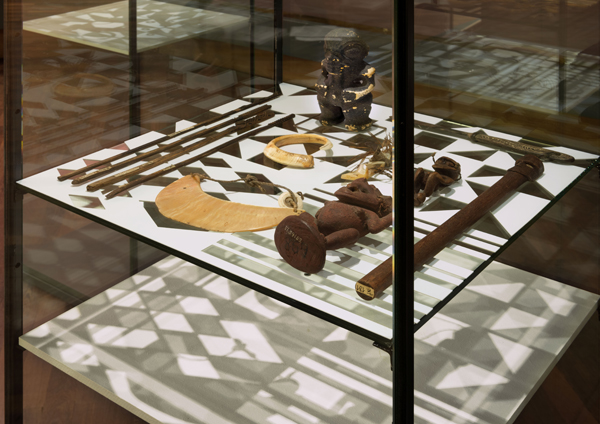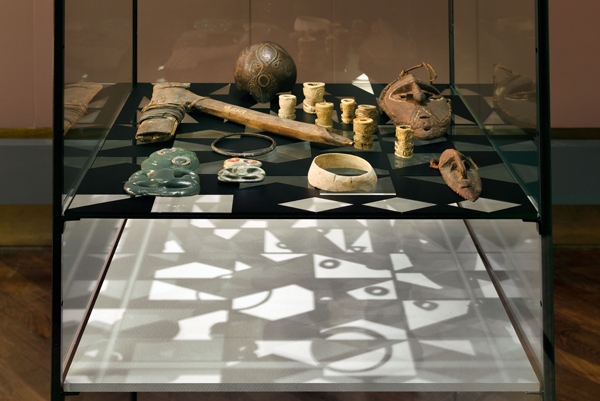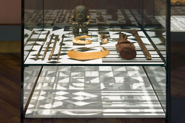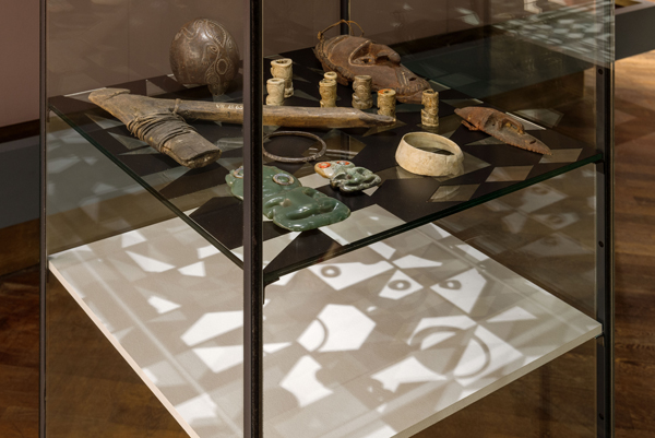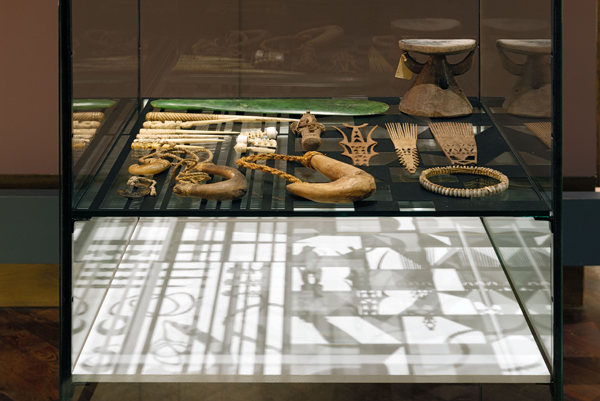 In her installation the artist uses geometrical patterns based on tapa. These she modifies, recombines, and employs as cut-out grids in her vitrines. She then arranges select objects from the Museum’s storerooms around these grids, imitating the arbitrary juxtaposition of artifacts geared to pictorial effect as found in illustrations in eighteenth- and nineteenth-century ethnographical literature. The artist places the objects according to associative formal and aesthetic principles without reference to origin or function. Sharp fishing hooks lie alongside earlobe piercers, bone tiki (figures of gods) designed to hold sacred locks of hair, a mask, an axe, or a coconut shell. Illuminated by a lamp, the exhibits and cut-out grid cast shadows that merge in a common projection. Their formal stringency bears similarities to contemporary visual patterns, their rhythm and regularity recalling the pixel grids of modern computer screens. At the same time, they show that the process of abstraction reduces three-dimensional, dynamic, highly complex reality to a flat, motionless, clear image that, however, is never complete. (Angela Rosenberg, Curator)