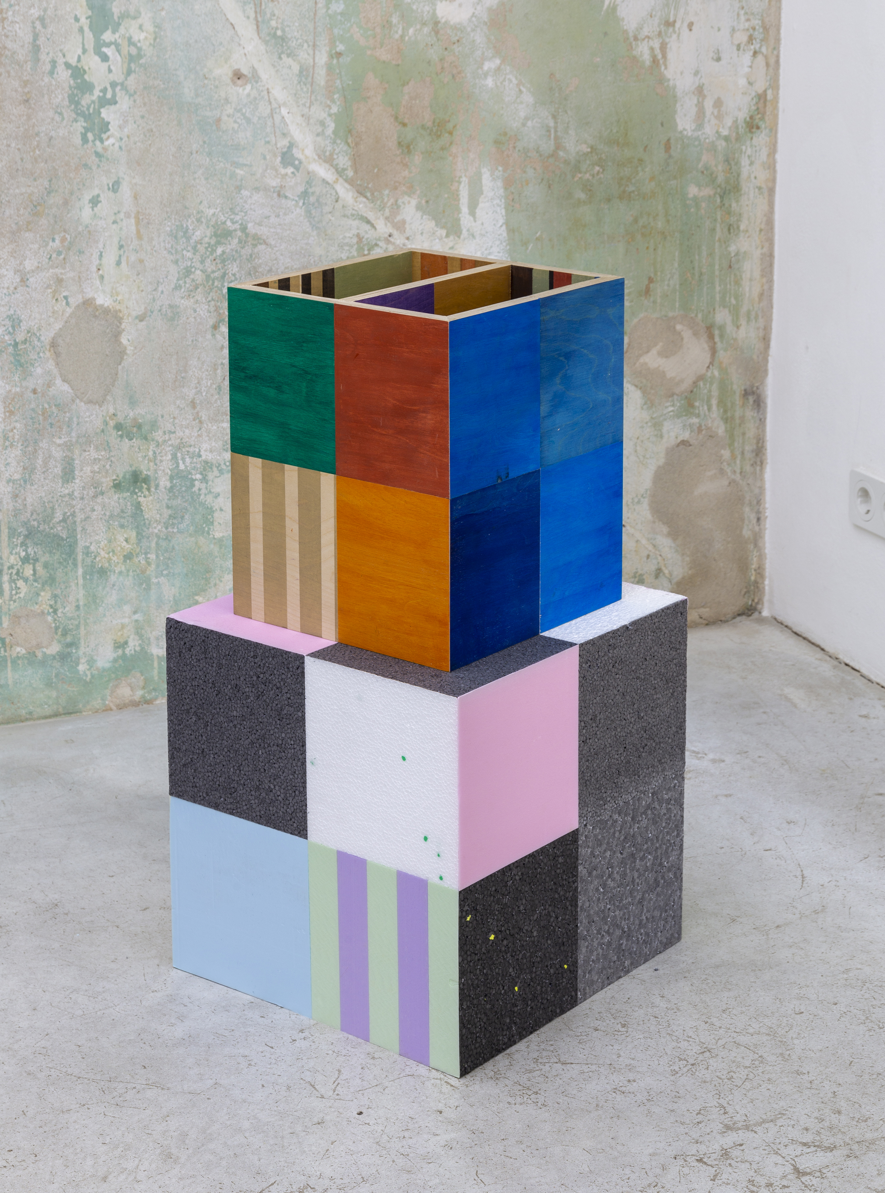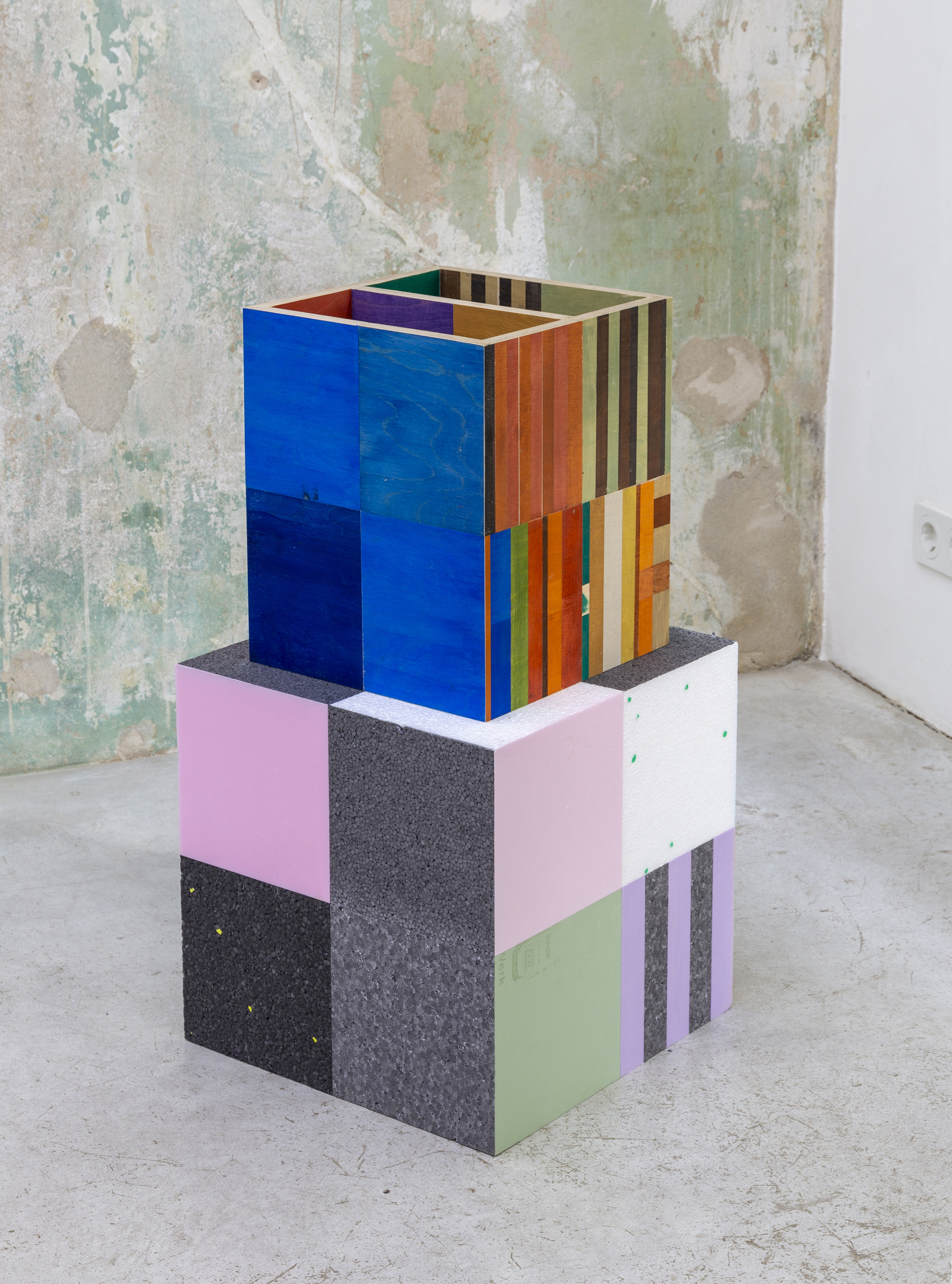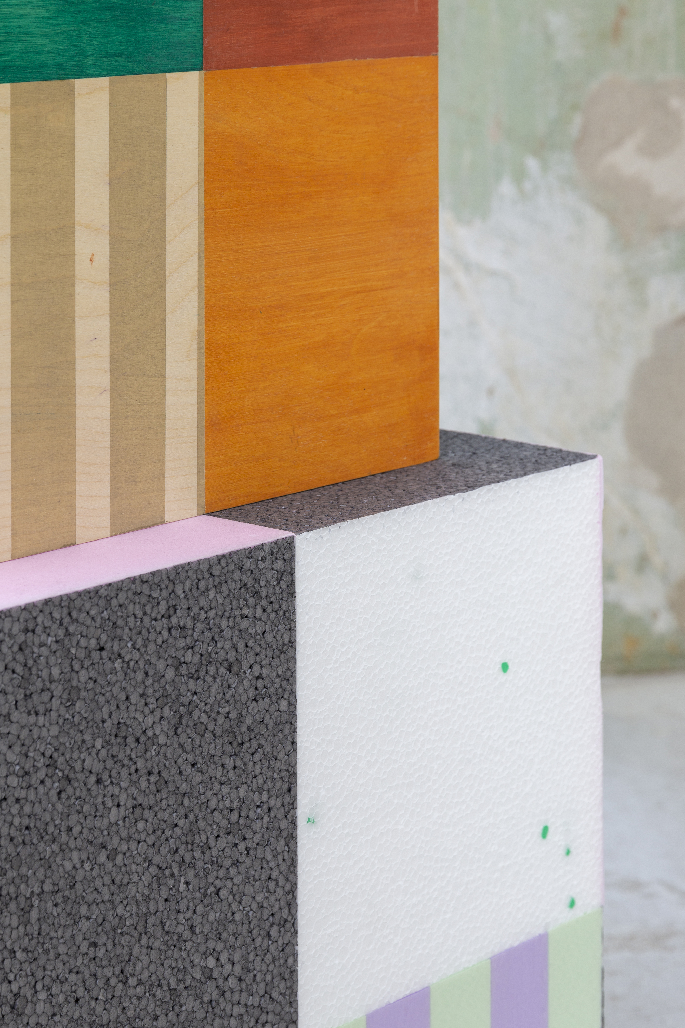 A polystyrene and styrofoam plinth (bottom part) of Tommy Støckel imitating a wooden schulpture (upper part) of Sunah Choi.