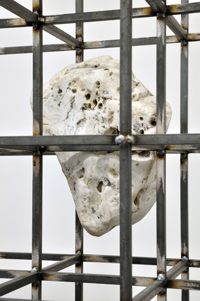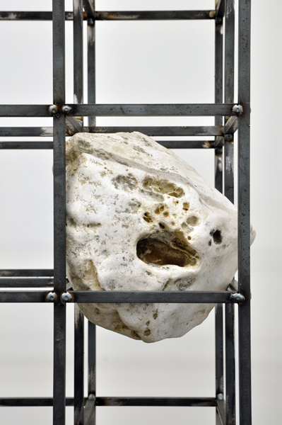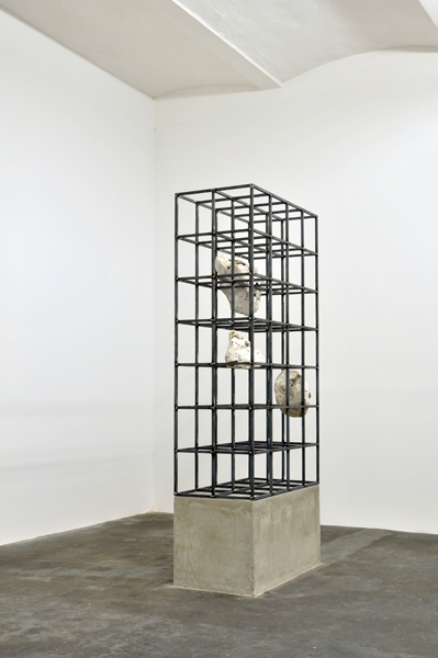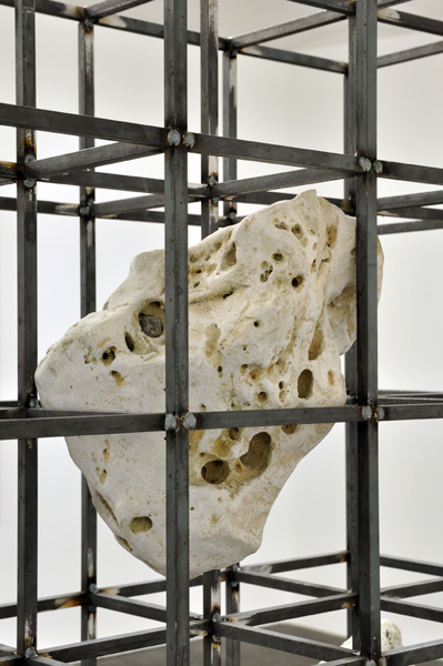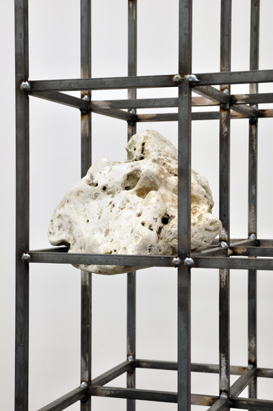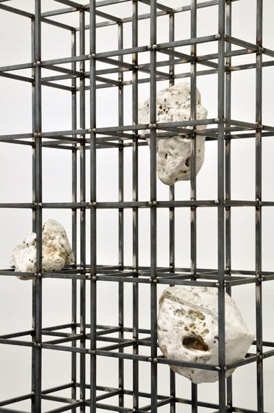 A steel framework consisting of several cubes produced by industrial construction methods is placed on a concrete pedestal. Wedged into its hollows are bright natural stones, which seem to be floating there.
