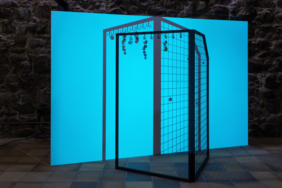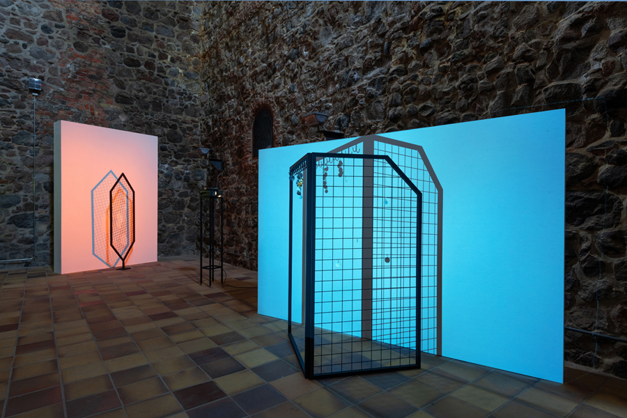 In Gestell (Rack), the sculpture comprises two rectangular steel frames set at a right angle to recall basic architectonic forms. One is fitted with steel mesh, the other with hooks from which small objects hang, vaguely suggesting a coat rack. The colored light of the projections casts the sculptures’ shadows onto the walls, which again bring windows to mind; but rather than establishing a channel of communication between the interior and the world outside, they add depth to the ensemble’s layered visual structure.