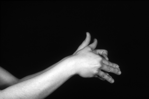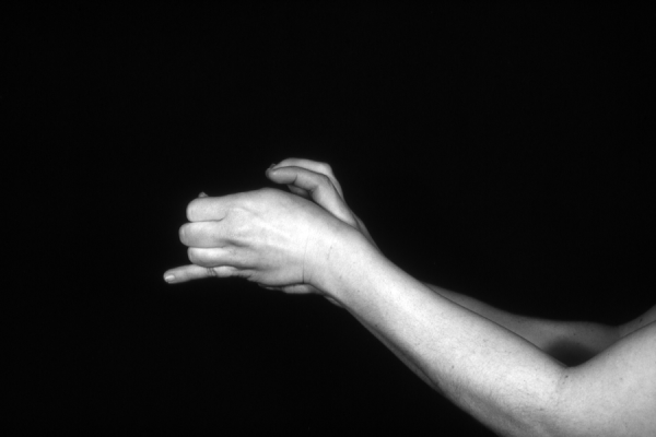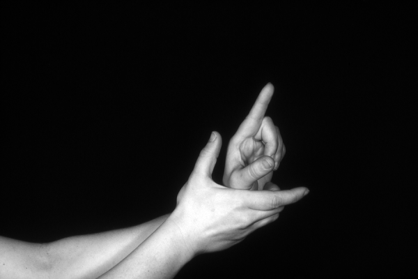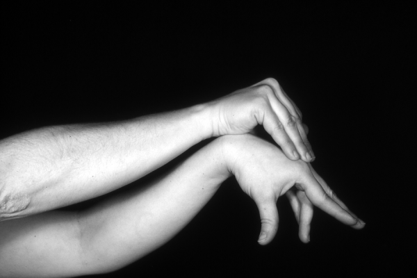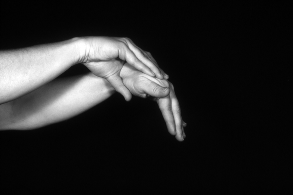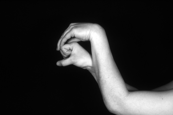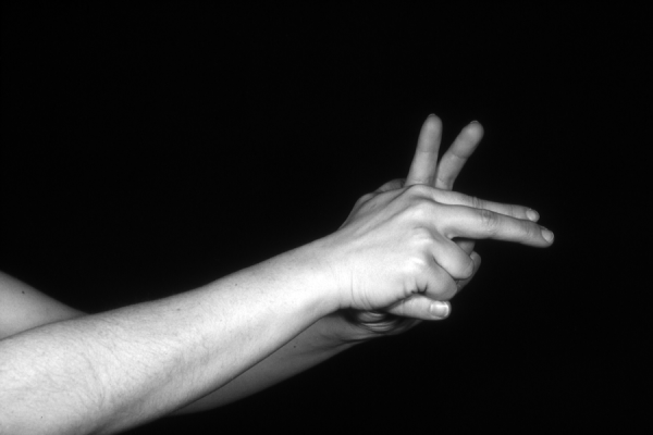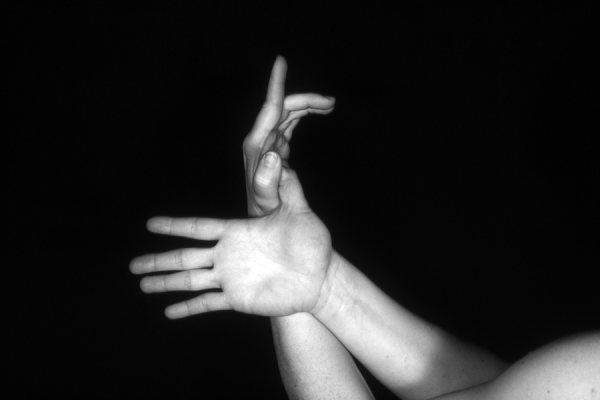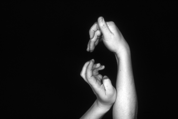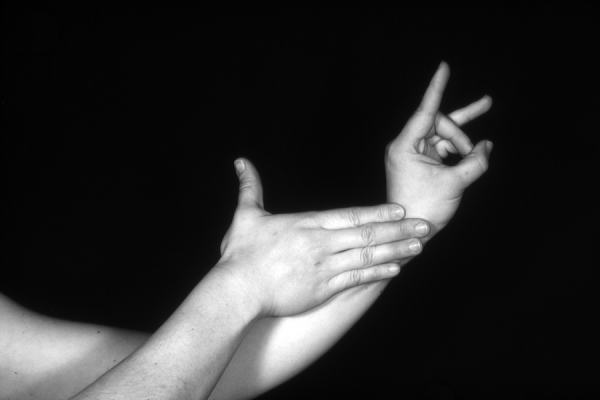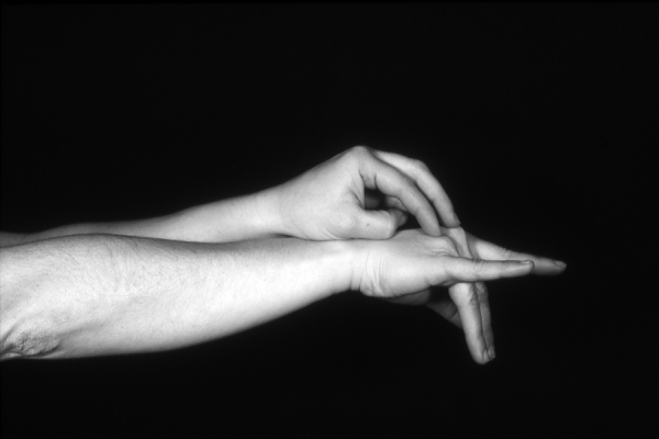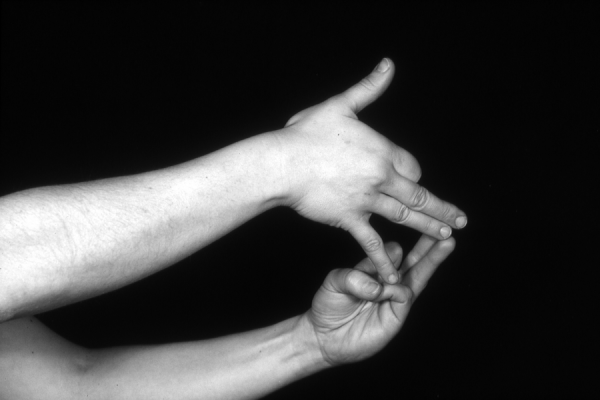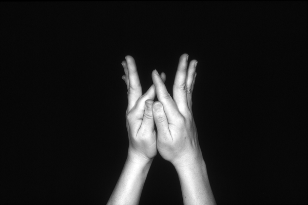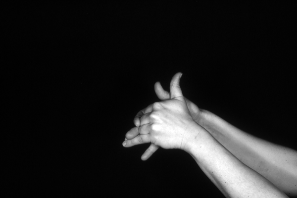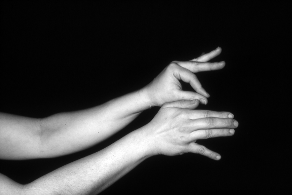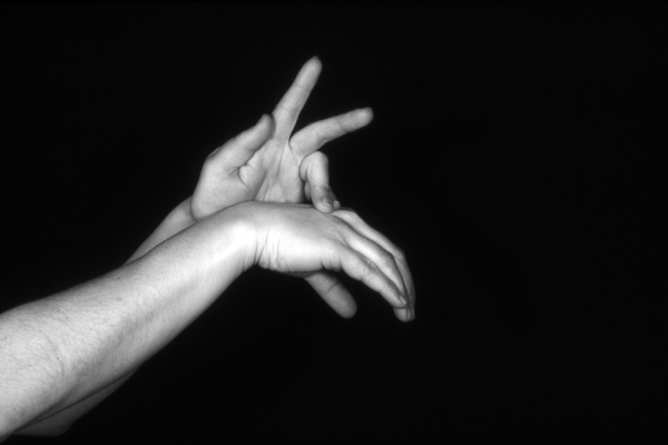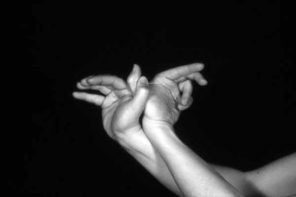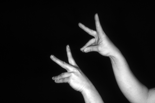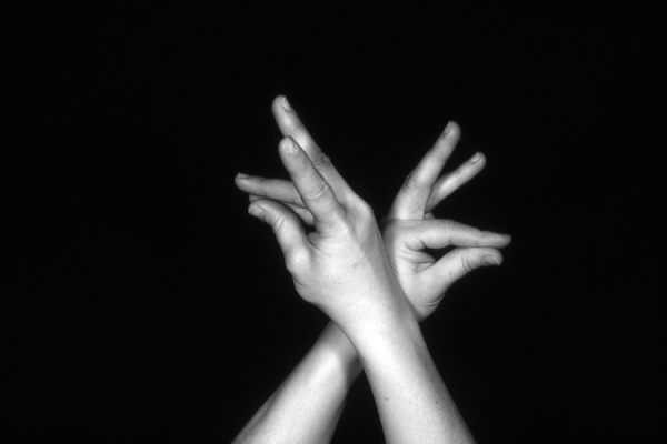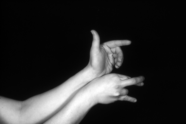 Hands are the basic tools of simple shadow puppetry, abstractly imitating the forms of animals. In contrast, here in the slide images the hands themselves are shown in front of a black background – without their shadows.