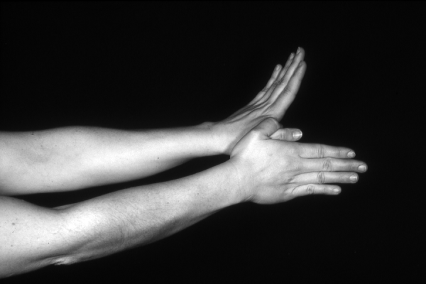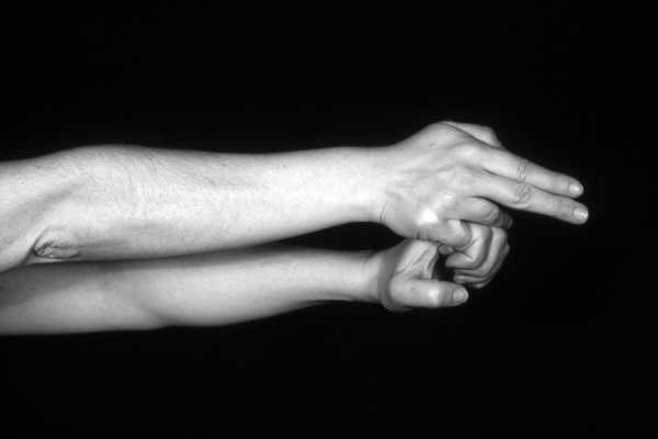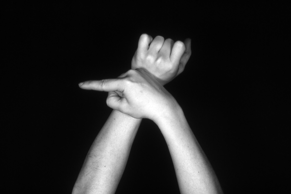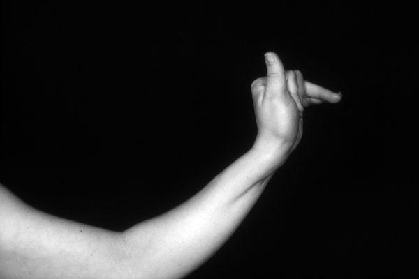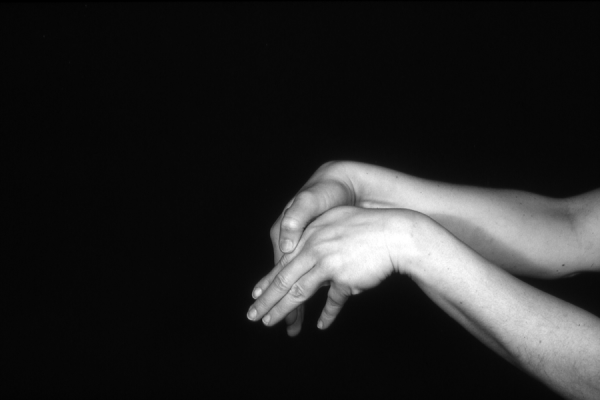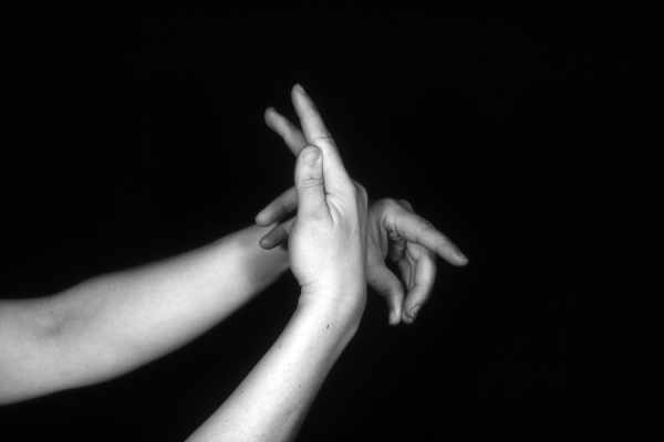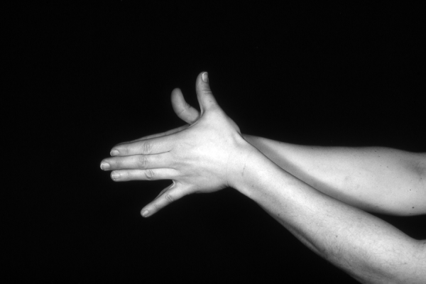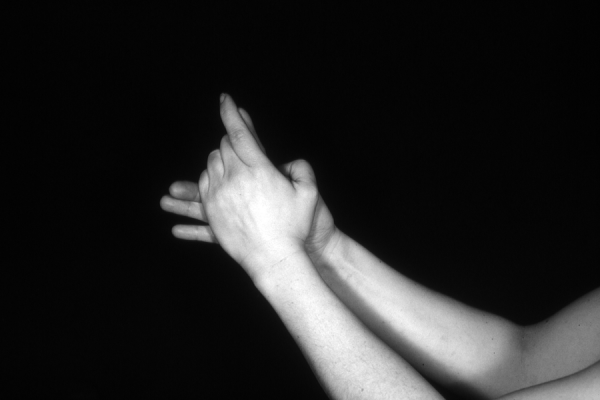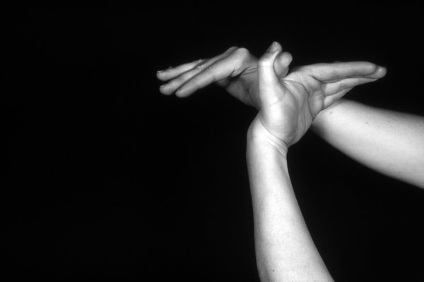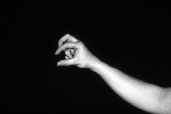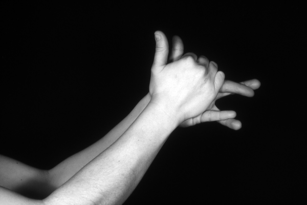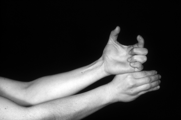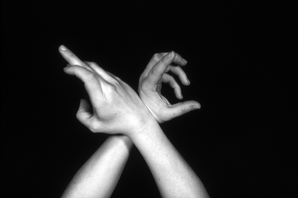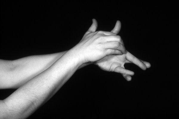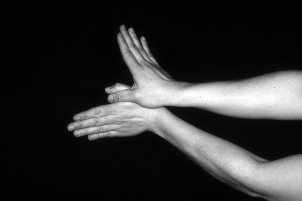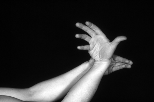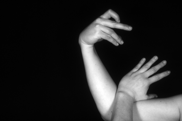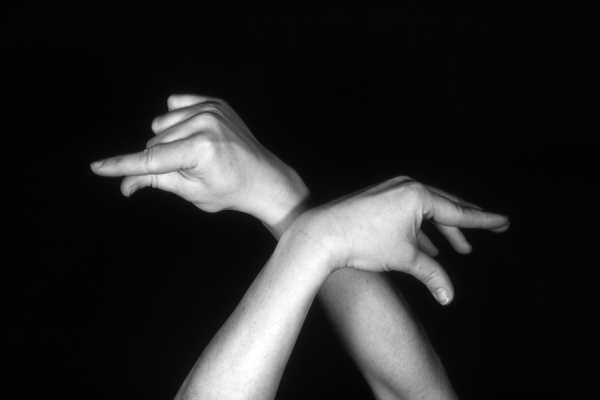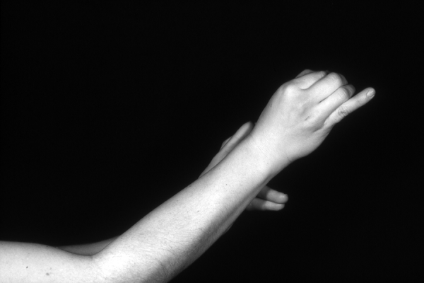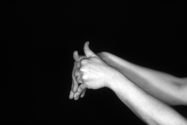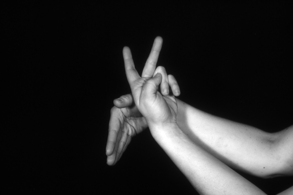Hands are the basic tools of simple shadow puppetry, abstractly imitating the forms of animals. In contrast, here in the slide images the hands themselves are shown in front of a black background – without their shadows.