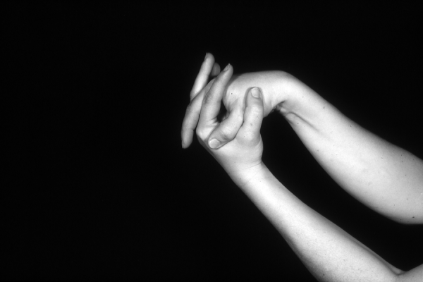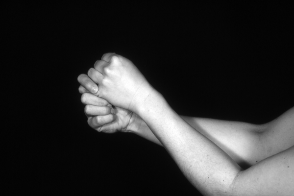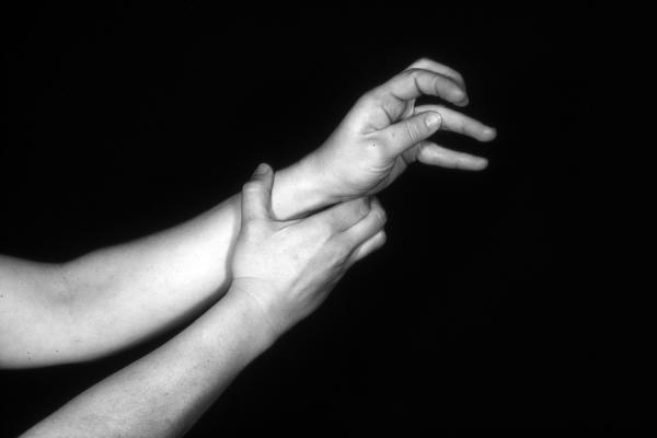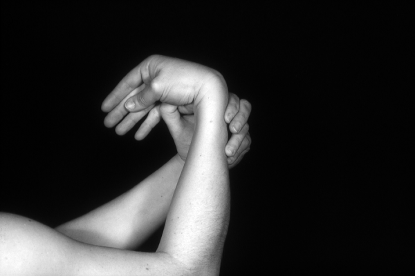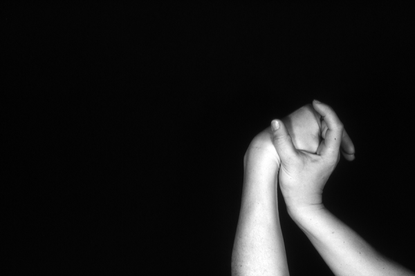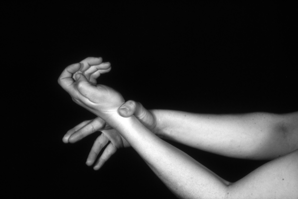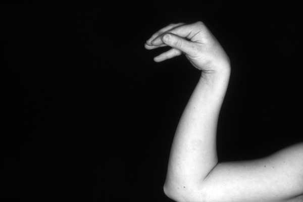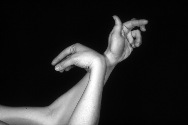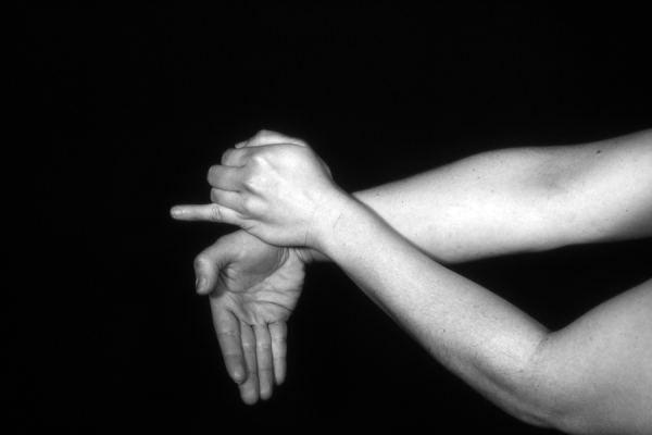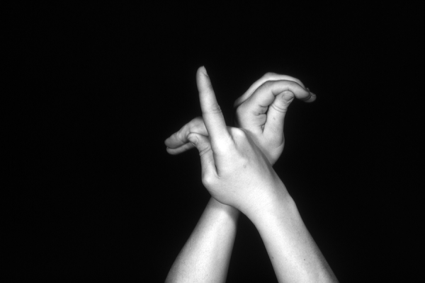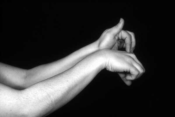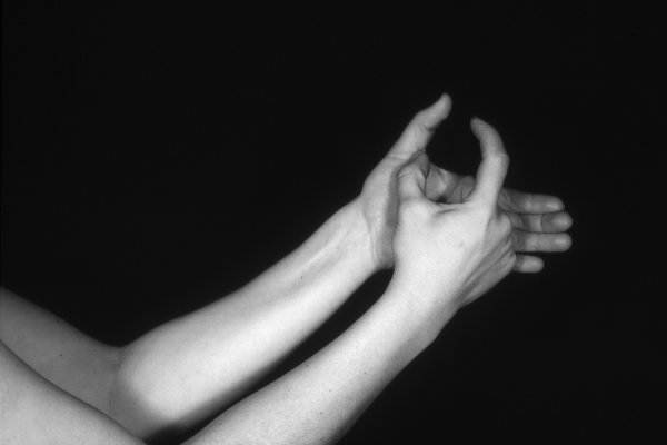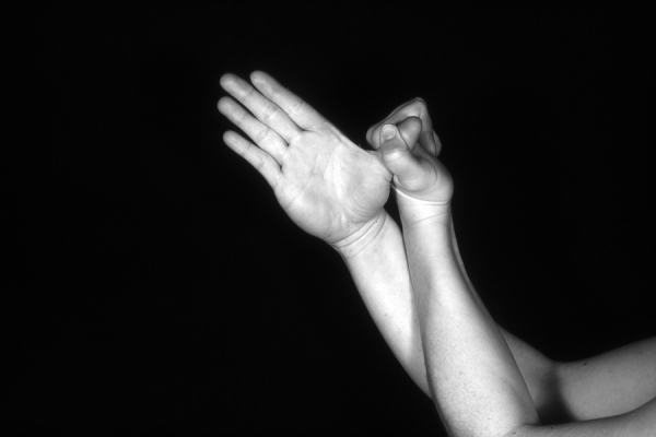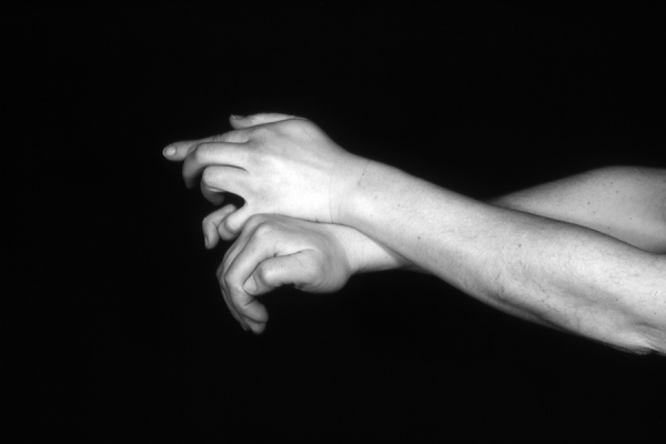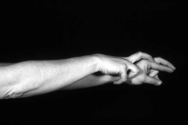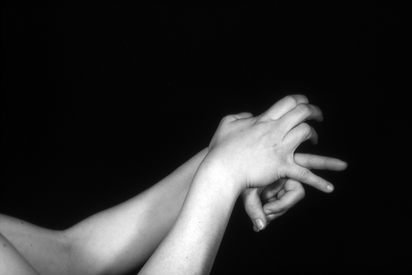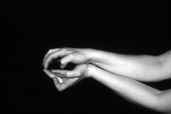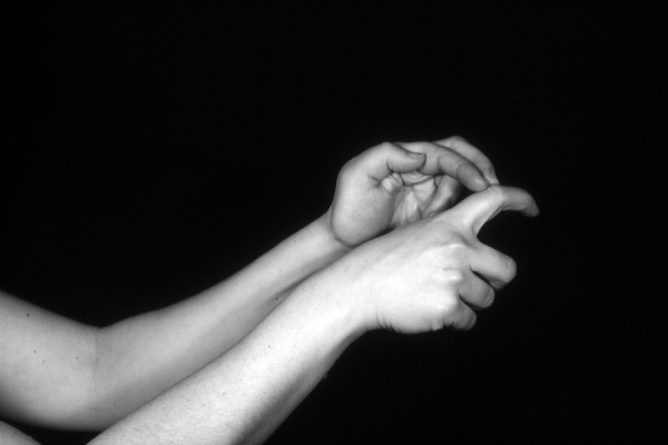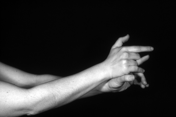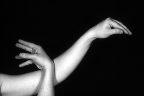 Hands are the basic tools of simple shadow puppetry, abstractly imitating the forms of animals. In contrast, here in the slide images the hands themselves are shown in front of a black background – without their shadows.