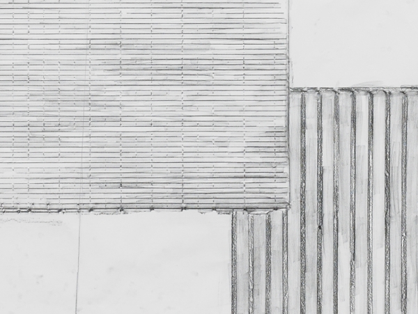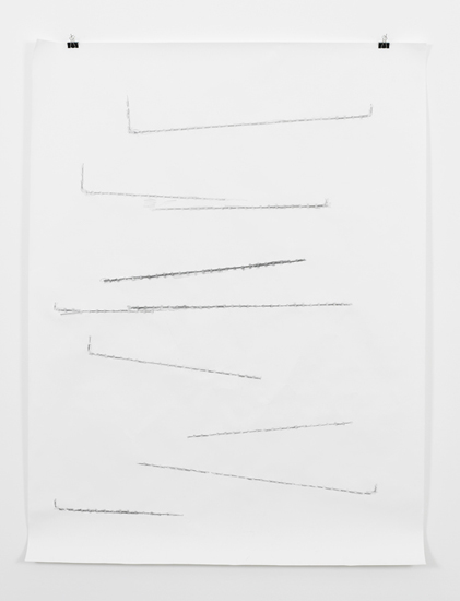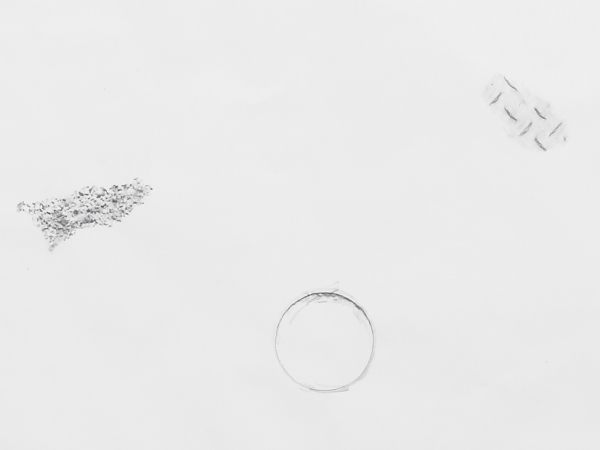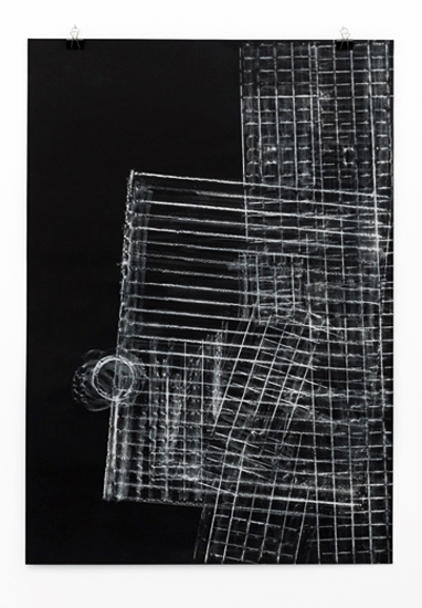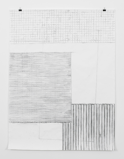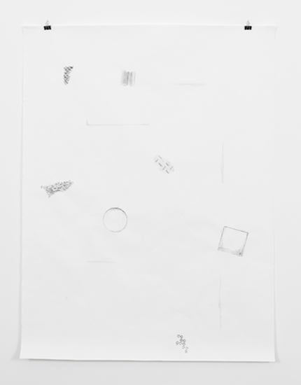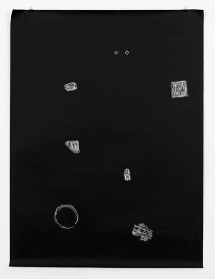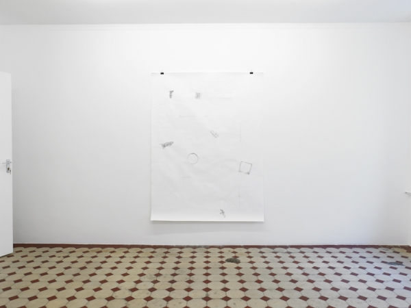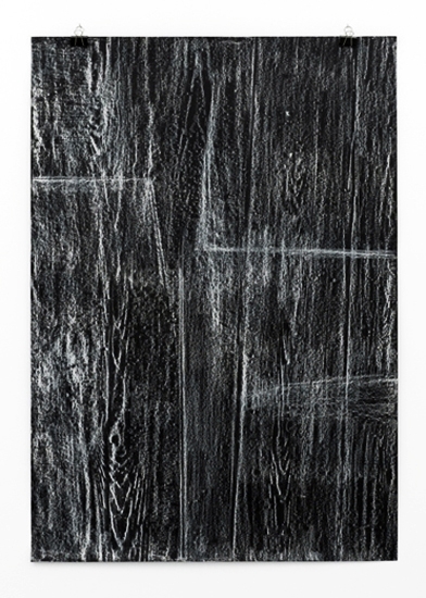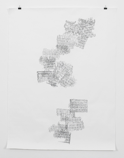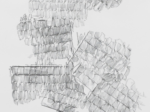The artist collected street imprints using the method of frottage. The act of rubbing patterns found on the street onto a sheet of paper implies a performative public action. The forms found on the sidewalk – grids, lines, meshes and so on – often dictated the method of frottage: swift collages or rather composed compositions were created according to the given situation. The environment was also collected and archived on paper, spotted with fluids from the foliage, insects, and bends created by wind and dirt. (Hili Perlson)