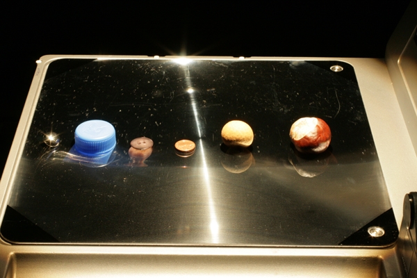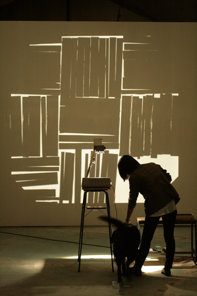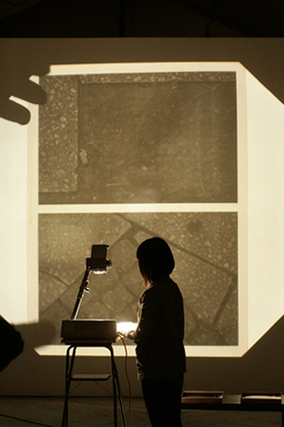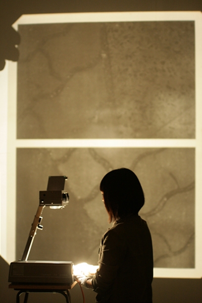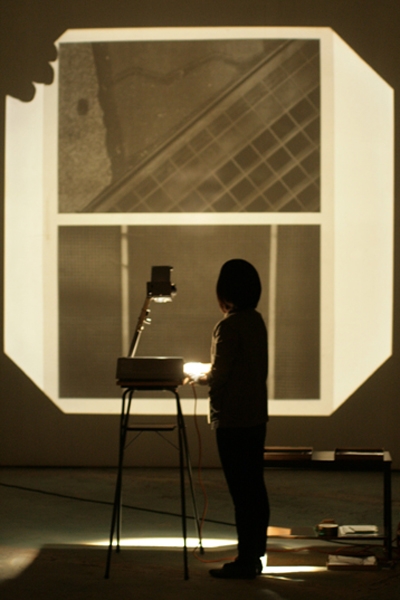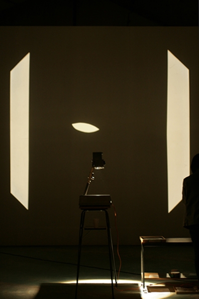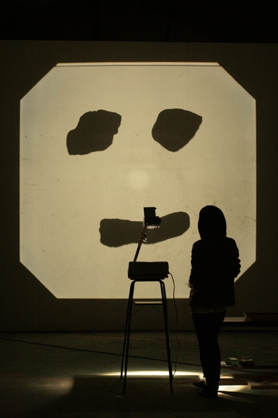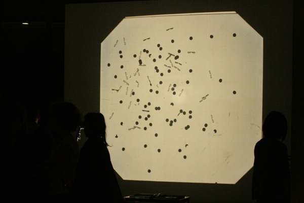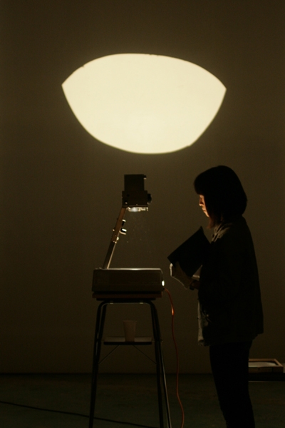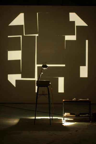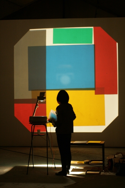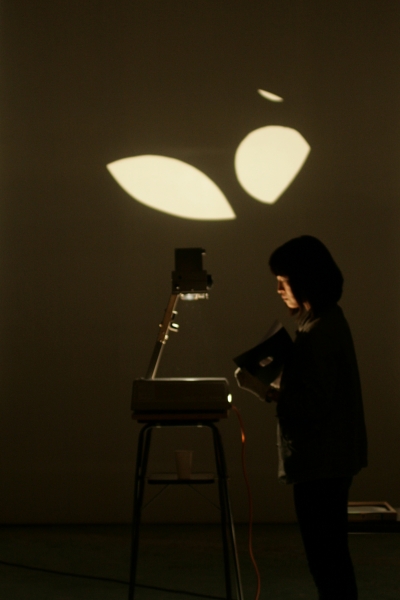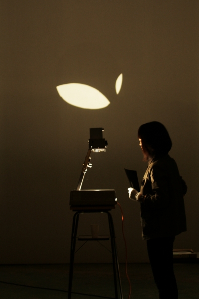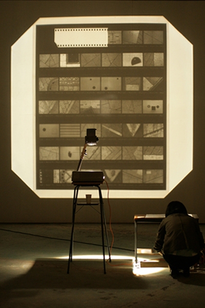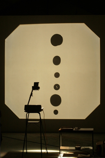 Working directly on an overhead projector, the artist arranges various everyday objects, paper cutouts and printed films in sequence. In the projection these objects and combinations of objects appear as large-format abstract forms and compositions. The sequence and structure of the individual series that are choreographed one after another have a playful relationship, both visually and in terms of content.