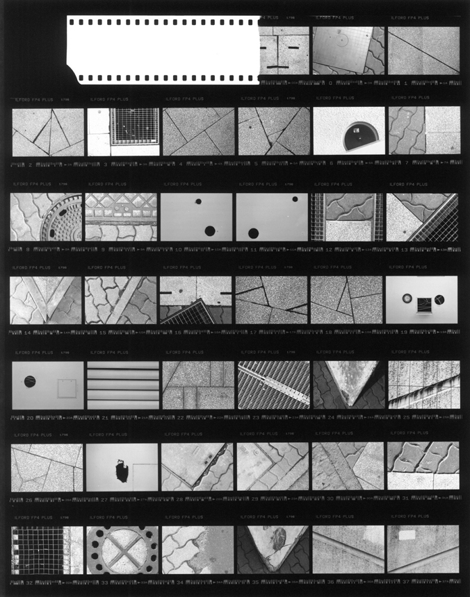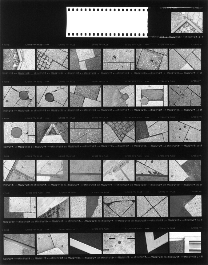 The photographs were taken in the immediate vicinity of Berlin Alexanderplatz. Through the selective eye of the camera familiar surfaces of public space were isolated and recombined. This results in abstractions made of geometric patterns. The form of the contact print make it impossible to manipulate the sequence of the photographs. The compositional decisions that determined the ensemble of the contact as a whole were only possible during the act of taking each picture.