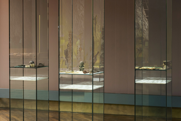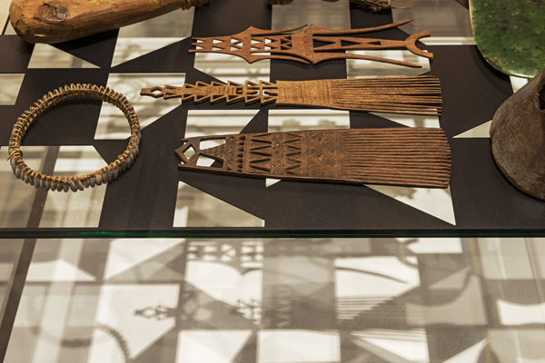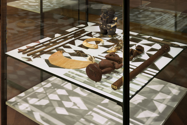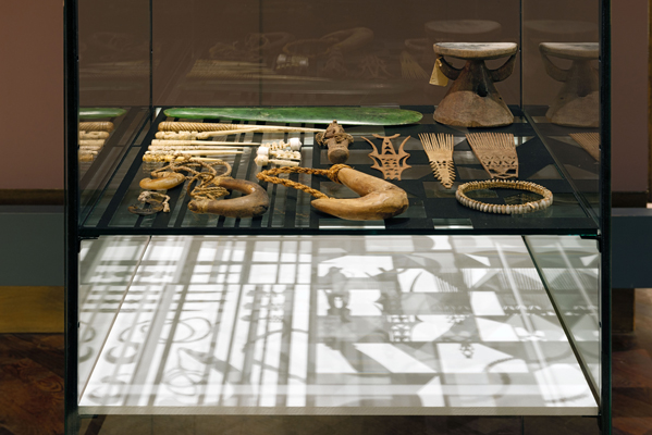 3 Stencils, objects from the oceania collection of the Ethnologisches Museum in 3 illuminated vitrines
