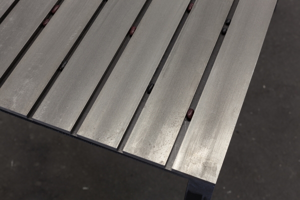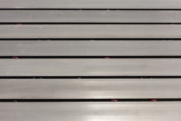The work consists of narrow metal table, between whose metal ribs beans are distributed on the tabletop. The arrangement recalls the sheet music for a composition. Through her choice of materials and the traces of manual intervention, the artist unites poetic and sterile qualities of the metal elements.