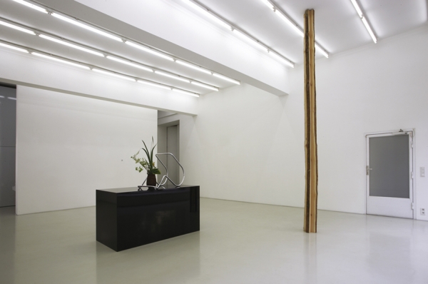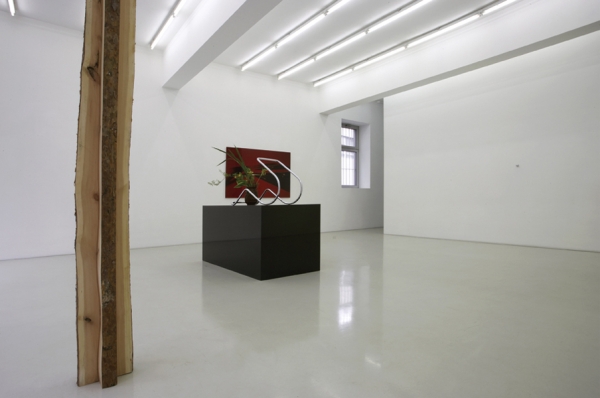 Tokonoma are alcoves in traditional Japanese houses that are symbolically separated from the room by wooden pillars and ornamented with a flower arrangement and a hanging scroll. This installation takes three different components of the Tokonoma and sets them in relation to European modernism.