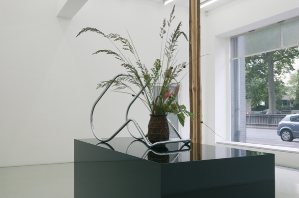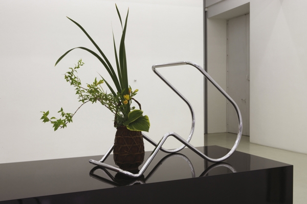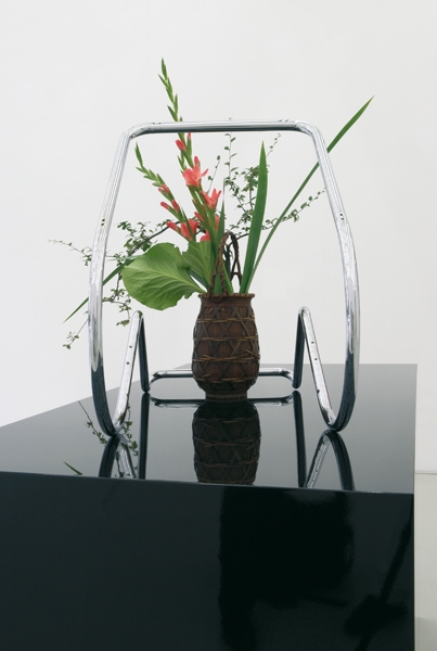 The plinth has the dimensions of stacked Tatami mats. A traditional Japanese Ikebana flower arrangement and the base of a Mies van der Rohe cantilever chair are exhibited on the plinth. The seat has been removed from the chair and the frame tipped forward so that the base rears up next to the flowers like a formalist abstract steel sculpture.