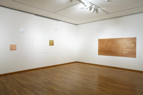 Untitled (Coins) II show eight sawed-out holes in a wooden board, which correspond exactly to the size of Euro and Korean Won coins.