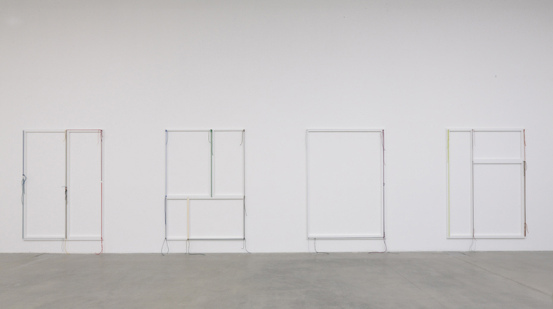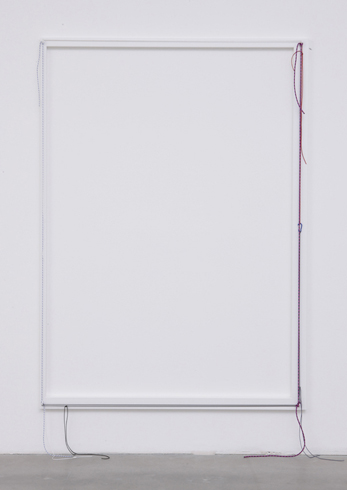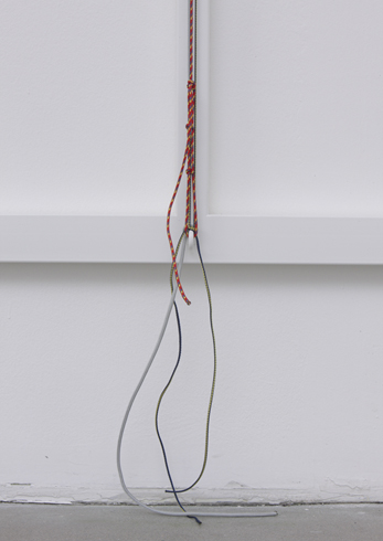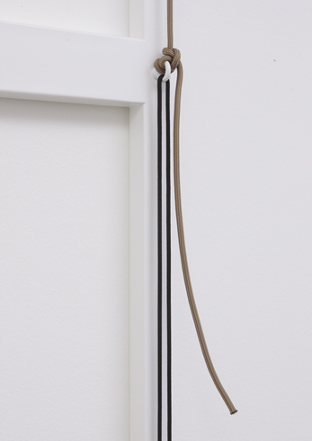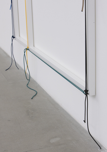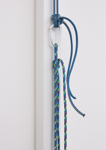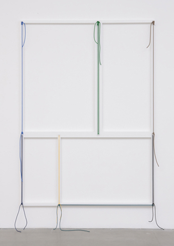 For the exhibition Un´Espressione Geografica the artist investigated the Italian region of Valle d´Aosta, and after traveling throughout the area she developed a site-related work. The region of Valle d´Aosta is situated on the Italian-French border, at the foot of the Alps near Mont Blanc. The high mountains have shaped the history of the region and have given it a particularly autonomous status. The work deals with the relationship of the inhabitants to their surroundings and living conditions. Sculptural juxtapositions and super-impositions of form and material visualize a process of abstraction. The simple forms of the four metal constructions are based on façade elements, which the artist photographed on buildings of the region in cropped compositions. Various climbing ropes have been playfully spanned on the white-coated metal constructions. The material of the climbing ropes refers directly to the region of the Alps. As visual elements they break up the metal structures, which despite their size have a rather unobtrusive appearance against the white wall.