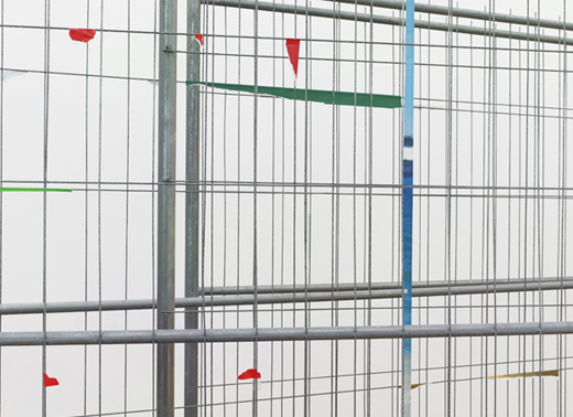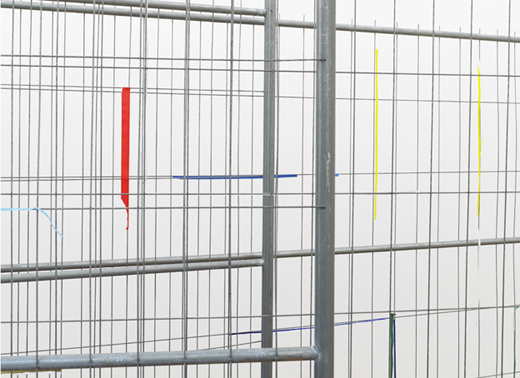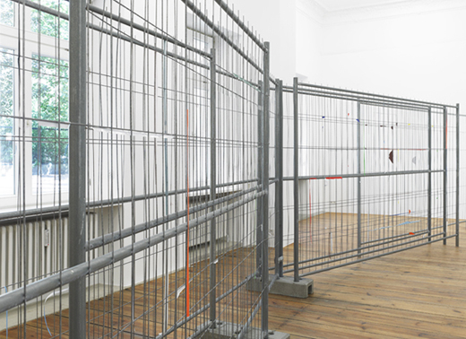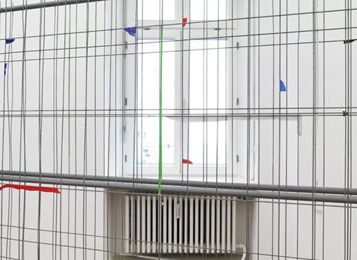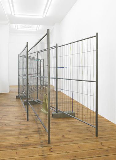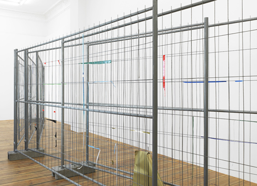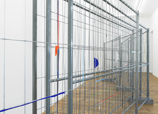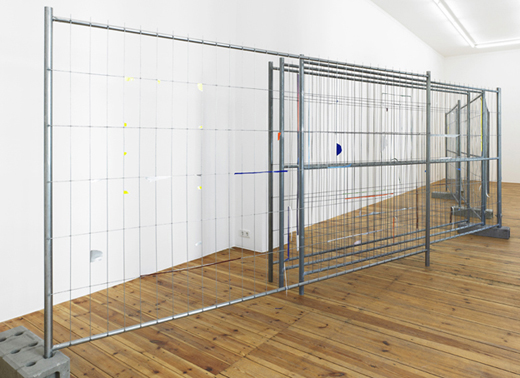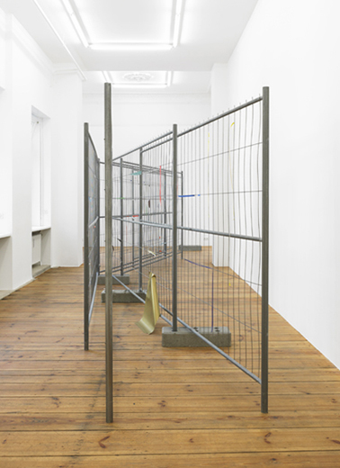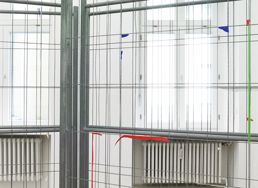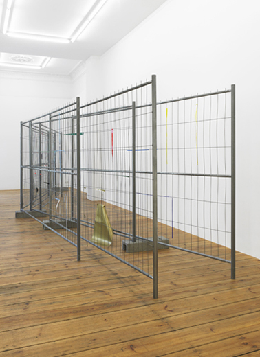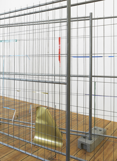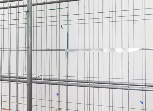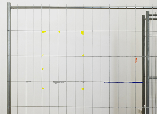 The carefully placed building site fence directs the pathway of the visitors through the narrow exhibition space. The geometric lines of the fence function as a framework, which the artist uses as the compositional basis for a three-dimensional collage. Building site fences covered with advertising posters are everywhere in urban space. In the exhibition the artist reconstructs this familiar city landscape with colored glossy paper and tape. Individual pieces of paper were initially taped onto the fence, and subsequently either the inner part of the paper was cut away or the piece was torn off completely, so that only corners or small strips of paper remain hanging on the metal, forming a composition of dots and lines. The act of removal and the absence of images create a new abstract image.